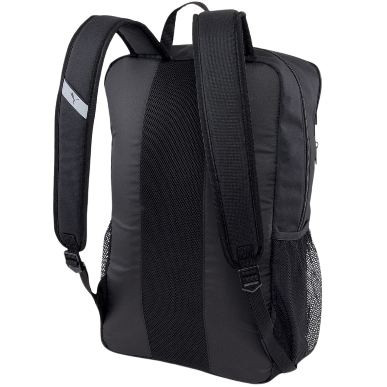 Plecak Puma to połączenie oryginalnego stylu i funkcjonalności w postaci dużej ilości kieszeni. Główna komora z przegrodą na laptopa i dwukierunkowym zamkiem. Przednia kieszeń umieszczona na górze i dwie frontowe kieszenie na zamek. Boczne kieszonki z siateczki wykończonej elastyczną gumką. Wyściełane profilowane szelki. Odblaskowe detale i oryginalnie umieszczone logo marki Puma. Częściowy, siateczkowy panel na plecach.