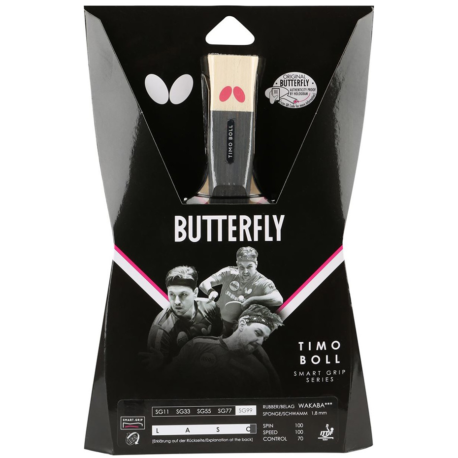 Rakieta do tenisa stołowego Butterfly Tim Boll sprawdzi się w czasie rozgrywek wśród zaawansowanych graczy o ofensywnym typie gry. Model zyskał wytrzymałą, drewnianą konstrukcje. Uchwyt o anatomicznym kształcie wykonany w technologii Smart Grip pozwala na osiągnięcie pewnego chwytu. Technologia Edge Guard. Całość zapakowana w estetyczne opakowanie.