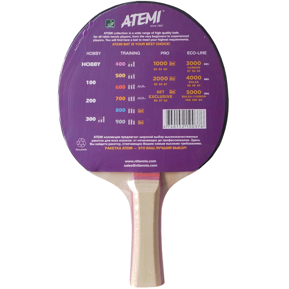 Rakietka do ping ponga New Atemi 300 to wyważony model do rekreacyjnej gry i doskonalenia techniki. 5-warstwowa sklejka jest lekka, a w połączeniu z piankową warstwą i gumową okładziną gwarantuje bezkonkurencyjną kontrolę nad przyjęciem piłki. Optymalne parametry w zakresie szybkości i rotacji. Ergonomiczny uchwyt typu concave. Maskująca taśma z logo marki. Certyfikat ITTF.