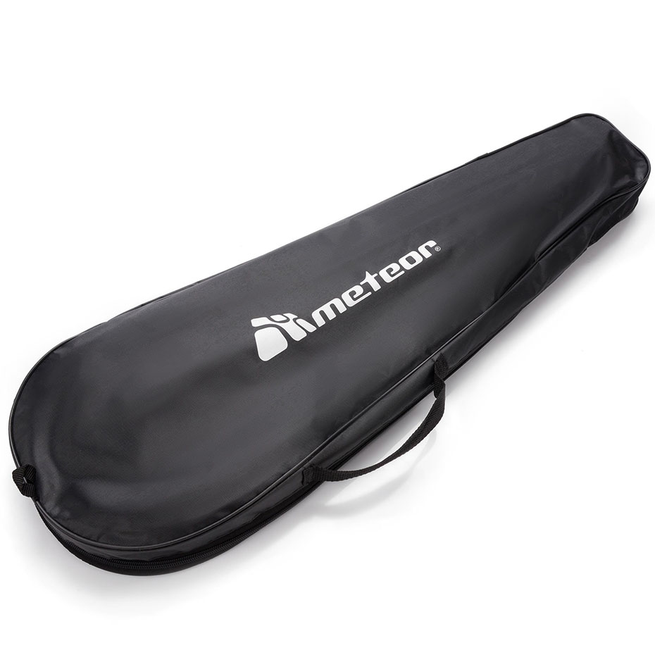 Zestaw Meteor sprawdzi się podczas gry w badmintona. Pokrowiec jest z jednej strony przeźroczysty, a z drugiej w czarny ozdobiony białym logo producenta.